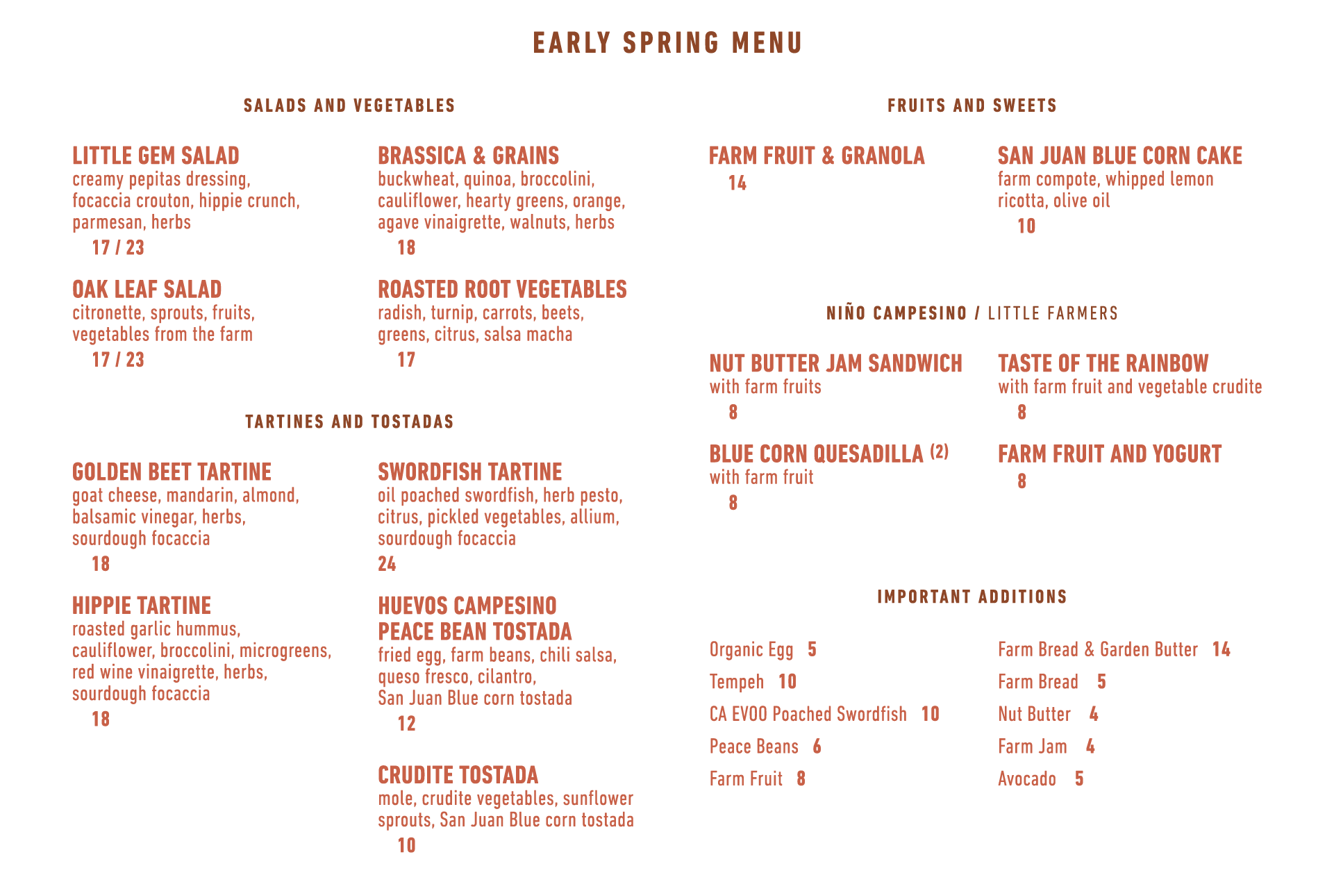 The best salads we know how to make; fresh juices; herby, funky, craveable flavors; roasted abundance that changes each day, chef’s choice; oven-warm rustic sourdough; San Juan Blue tostadas; Peace Beans.